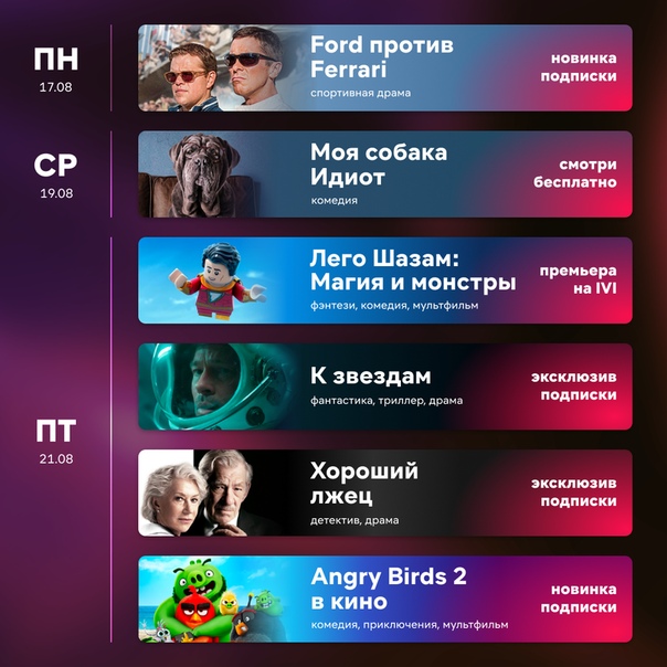 От легендарных автогонок и космических перелетов до погружения внутрь человека — представляем IVI-гаи?д! «Ford против Ferrari» — битва автомобильных титанов с Кристианом Бэи?лом и Мэттом Дэи?моном. «Психопаспорт. Грешники системы» — антиутопичное аниме c расследованиями и экшеном.Показать полностью… «Моя собака Идиот», а еще верныи? друг творческому человеку с кризисом среднего возраста. «Морские паразиты» воплощают в жизнь поговорку «женщина на корабле к беде». «Лего Шазам: Магия и монстры» — только в мире кубиков могут встретиться Шазам, Супермен, Бэтмен и Чудо-Женщина. «К звездам» — Брэд Питт в поисках отца на окраинах Галактики. «Хорошии? лжец» — когда ты профессионал в аферах, но любитель в любви. «Angry Birds 2 в кино» — заклятые враги птицы и свиньи объединяются против общего врага. «Безжалостныи? город» — здесь нет второго шанса, когда угрожают наркокартели и бандиты одновременно. А еще? на IVI более 80 000 фильмов, сериалов и мультиков!
